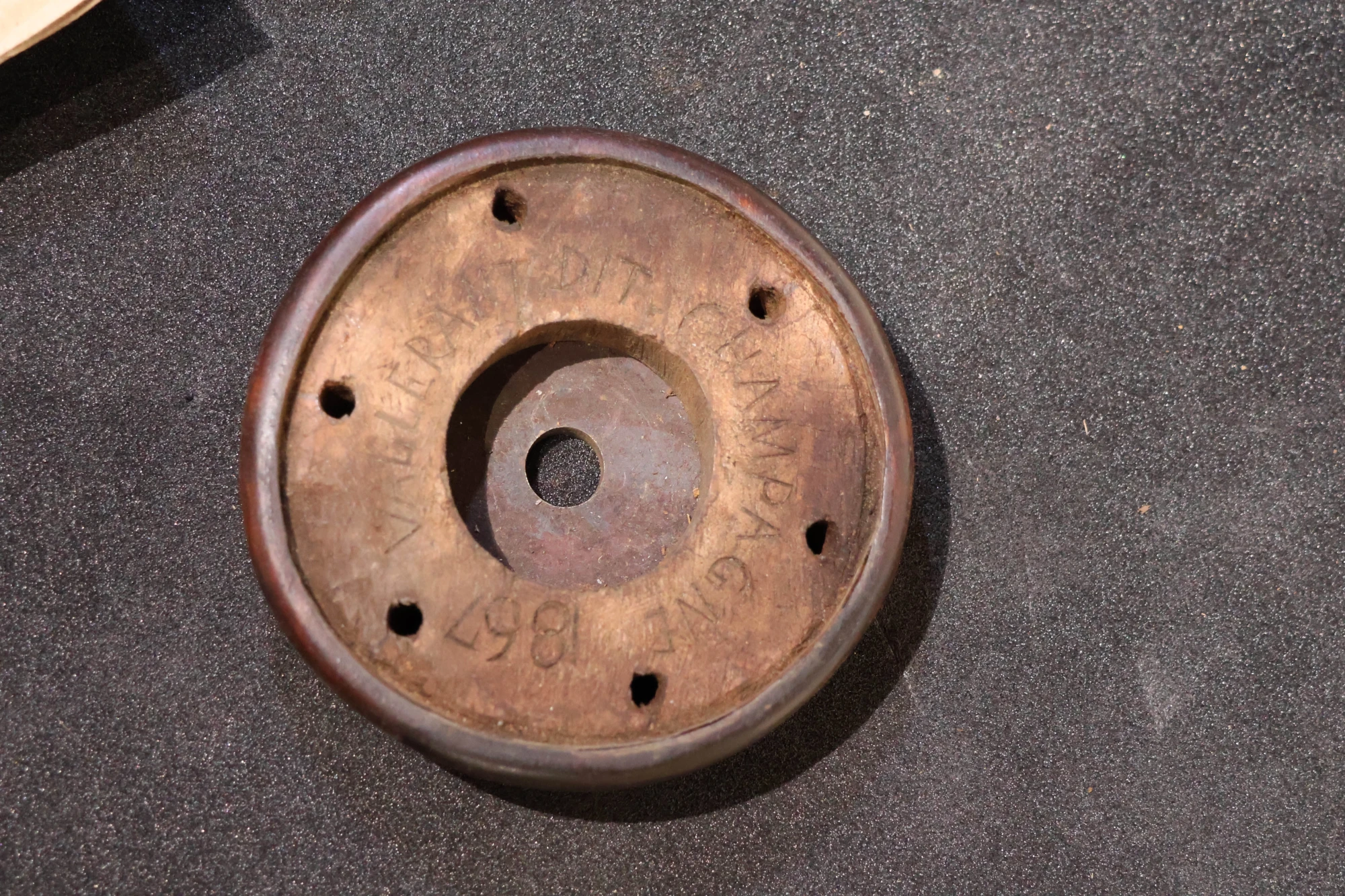 La découverte la plus inattendue fut le nom d’un Compagnon menuisier du devoir de liberté (MDDDL) gravé sur la bague de bois du fond du culot : Vallerant dit Champagne 1867. Enfin nous pouvions trouver la réponse à une question posée depuis longtemps.  Mais Vallerant avait-il restauré l’œuvre en 1867 ou avait-il réalisé le culot ? En fait nous avions toujours une interrogation : pourquoi le culot ne correspondait pas au plan ?
