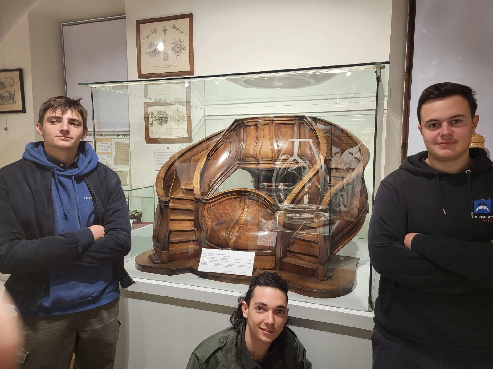 Ces quatre années entre l’écriture du projet en 2021 et sa réalisation finale en 2025 représentaient une attente, celle de jeunes itinérants volontaires pour réaliser un nouveau socle, suivant un cahier des charges très précis. C’est à Limoges en septembre 2024, que Paul Daburon, menuisier, Tanguy Besson métallier et Bastien Gravelet, ébéniste devaient s’engager dans l’aventure. L’objectif était aussi de devenir Affilés dans le DDDL. Ils avaient deux années de tour de France à leur actif. Leur socle n’a été dévoilé que le jour inaugural, au musée, le 18 octobre. De fer et de bois, il comporte 4 panneaux marquetés : Salomon, 3 cannes pour nos 3 métiers, la carte de France pour le Tour de France et une poignée de main pour la fraternité.