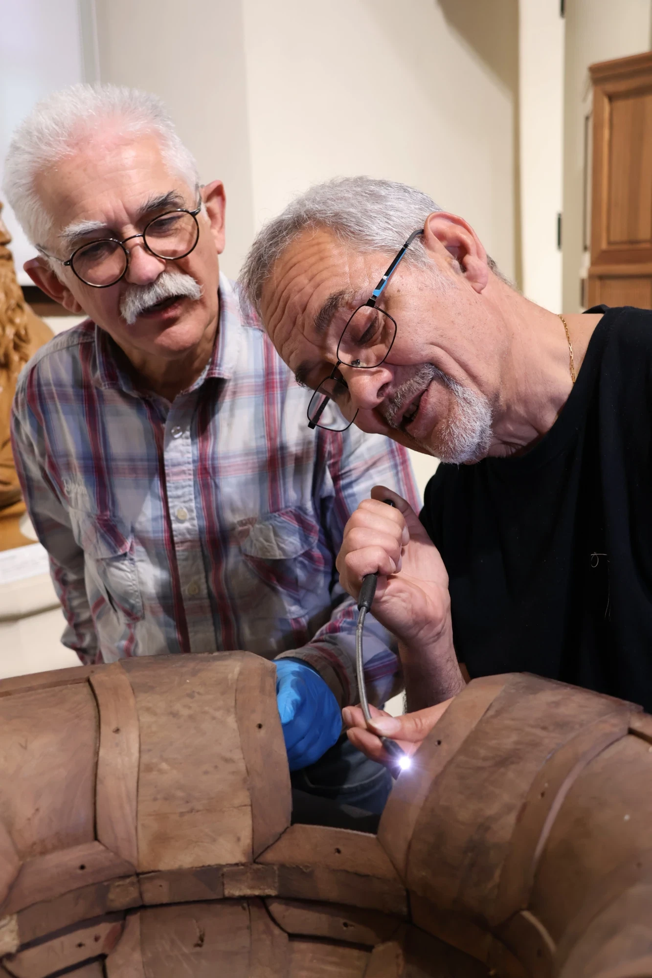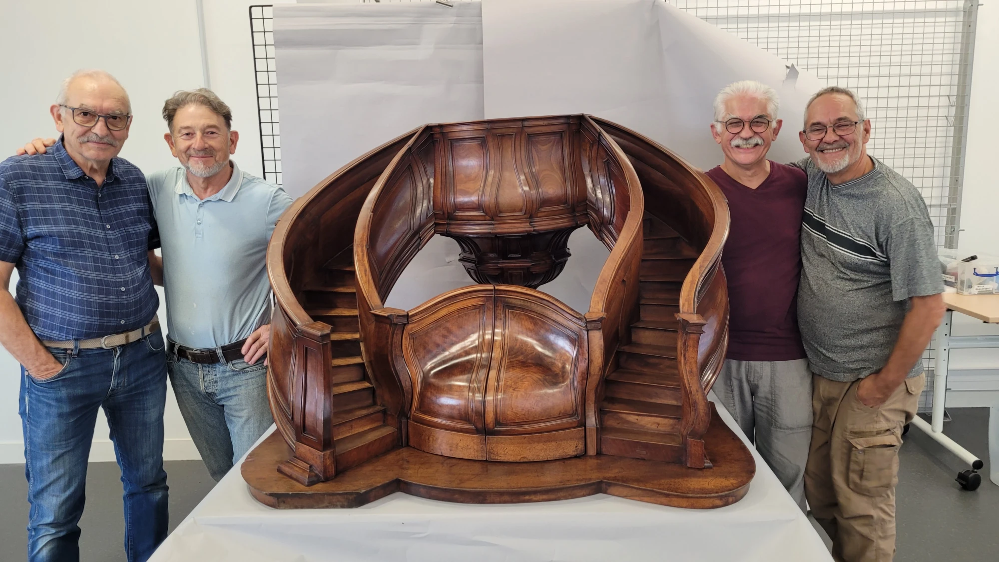 En 1968, avant son installation dans le musée, une équipe de six compagnons menuisiers et six jeunes réalisèrent une intervention de restauration. Hélas ils nous laissèrent peu de renseignements si ce n’est des dates et des noms inscrits sur un parchemin enfermé dans le culot de la chaire. Si nous savions qu’il était là, nous ignorions ce qu’il contenait. Ce fut la première découverte lors du démontage en avril 2025. Les noms de tous les acteurs et élus de la société y étaient inscrits. Nous avons laissé à notre tour un message aux futurs intervenants. Nous avons fixé dans un logement réalisé sous le socle, une carte mémoire numérique contenant tous les éléments historiques que nous avons, accompagnés de toutes les photos et reportages sur l’étude et la restauration de la chaire (1358 fichiers).