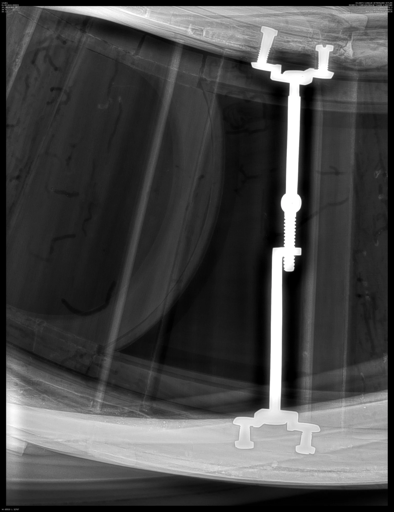 Une autre découverte, que nous soupçonnions, lors du démontage. Sur les limons des deux escaliers des greffes de bois de formes géométriques placées en face les unes des autres, nous indiquaient une intervention de renfort des limons intérieurs et extérieurs de chaque escalier. Mais quel type de renfort et comment sont-ils ? Afin d’avancer dans cette recherche nous avons fait intervenir un vétérinaire qui avait un agrément pour faire des radiographies X en dehors de son activité animalière. Nous avons pu observer sur les clichés trois renforts métalliques sur chaque escalier, plusieurs tiges filetées avec leurs écrous et des myriades de pointes. À l’observation de la facture des renforts, filetages réalisés manuellement, ils devraient avoir été exécutés dans les années 1825/30. En effet tous les éléments de la chaire furent collés lors de son exécution. Les moyens de conservation de la chaire entre 1803 et 1830 ne pouvaient pas être parfaits, le climat a dû faire son œuvre sur les colles naturelles employées à cette époque.